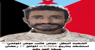 لحج (حضارم اليوم) فهد حنش أبو ماجد استُشهد يوم أمس الجمعة 6 مارس 2026م المناضل البطل عوض غالب المولعي اليافعي في جبهة الحد بمديرية يافع أثناء أدائه لواجبه الوطني في ميادين الشرف والبطولة حيث ارتقى إلى جوار ربه مقبلاً غير مدبر وهو يذود عن الأرض والعرض والكرامة والدين مسطراً بدمائه …