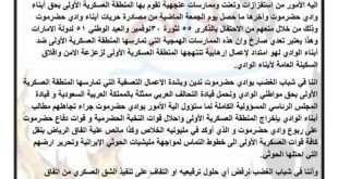حضارم اليوم /متابعات بيان صادر عن شباب الغضب بوادي حضرموت نص البيان : يتابع شباب الغضب المجريات والاحداث المتسارعة في وادي حضرموت خلال الفترة الماضية وما آلت فى وادي حضرموت اليه الأمور من استفزازات وتعنت وممارسات عنجهية تقوم بها المنطقة العسكرية الأولى بحق أبناء وادي حضرموت وآخرها ما حصل يوم …