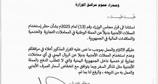 عدن(حضارم اليوم) متابعات وجه معالي وزير النقل الدكتور عبدالسلام صالح حُميد رؤساء الهيئات والمؤسسات والشركات ومدراء عموم المرافق التابعة للوزارة بالالتزام والعمل بموجب قرار مجلس الوزراء رقم (13) لعام 2025م بشأن حظر استخدام العملات الأجنبية، بديلاً عن العملة الوطنية في المعاملات التجارية والخدمية والتعاقدات المالية في الجمهورية، والتي لا تتطلب …