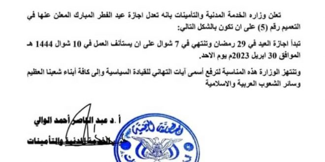 تبدأ اجازة العيد في 29 رمضان وتنتهي في 7 شوال على ان يستأنف العمل في 10 شوال 1444 هـ الموافق 30 ابريل 2023م يوم الأحد. وتنتهز الوزارة هذه المناسبة لترفع أسمى آيات التهاني للقيادة السياسية وإلى كافة أبناء شعبنا العظيم وسائر الشعوب العربية والاسلامية.