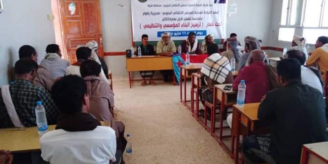 عقدت القيادة المحلية للمجلس الانتقالي الجنوبي بمديرية رضوم صباح اليوم السبت الموافق ١١ مايو ٢٠٢٤م اجتماعها للفصل الأول لعام 2024م تحت إشراف القيادة المحلية للمجلس الانتقالي الجنوبي بمحافظة شبوة تحت شعار (ترسيخ البناء المؤسسي والتنظيمي) وفي مستهل الاجتماع الذي بدأ بقراءة آيات من الذكر الحكيم، ثم الاستماع للنشيد الوطني الجنوبي، وقراءة الفاتحة على اروح الشهداء الذي ضحوا في سبيل استعادة الوطن و أمنه واستقراره .