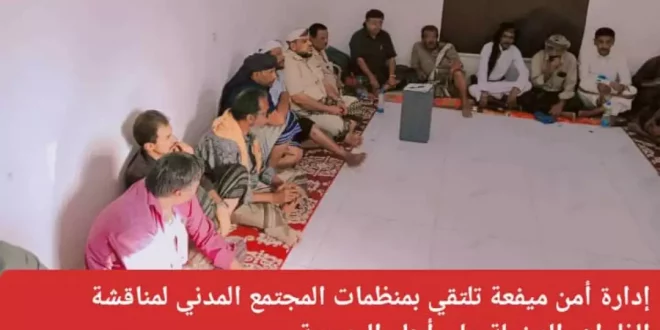 في إطار العمل المشترك بين الأجهزة الأمنية ومنظمات المجتمع المدني، التقى مدير شرطة مديرية ميفعة، المقدم ناصر رويس العولقي، ونائبه النقيب فهمي مقبل ناصر لكرش باعوضة ومدير البحث الجنائي بالمدير عبدالعزيز عوض لصحر اليوم الجمعة، بمنظمات المجتمع المدني الممثلة بعقال الحارات ومشايخ وأعيان ووجهاء المديرية لمناقشة جملة من القضايا، أهمها ظاهرة السرقة التي ظهرت في الأيام الماضية، وكذا ترويج الشبو والمخدرات بأنواعها وأشكالها.