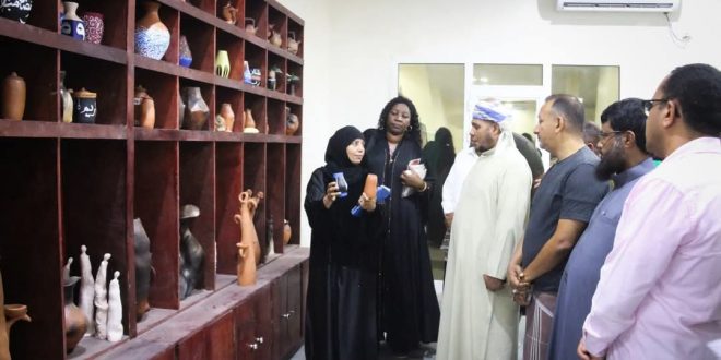واستمع المحافظ الثقلي إلى شرحٍ مفصلٍ من إدارة المركز حول الدورات التدريبية وورش العمل المقدمة في مجالات حياكة المعاوز، وصناعة الفخار، وسعف النخيل، والرسم، والخط العربي.
