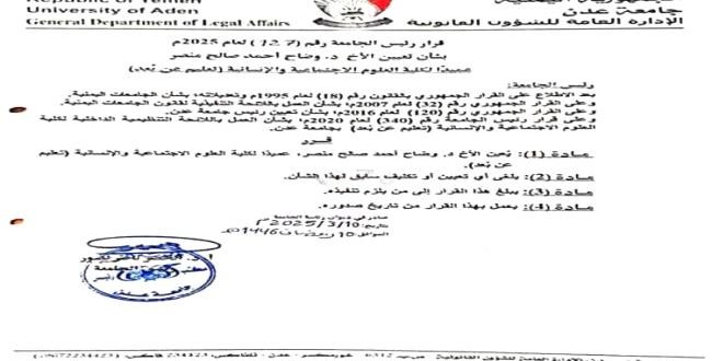 صدر قرار رئيس جامعة عدن أ.د. الخضر ناصر لصور رقم 127 لعام 2025م بشأن تعيين د. وضاح احمد صالح منصر ، عميدا لكلية العلوم الاجتماعية والإنسانية بجامعة عدن “التعليم عن بعد”.