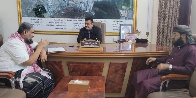 جاء ذلك، خلال لقائه في مكتبه بديوان عام السلطة المحلية في المديرية، بمدير عام مكتب الأوقاف والإرشاد بعدن، الدكتور محمد حسين الوالي، لمناقشة أوضاع المساجد، والوقف والإرشاد الديني في مديرية المنصورة.