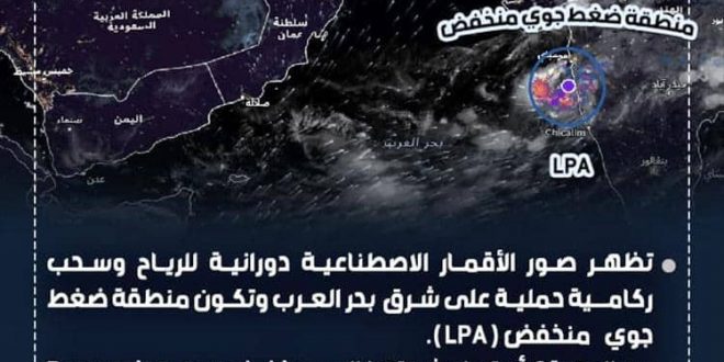 أكد مركز التنبؤات الجوية والإنذار المبكر في الهيئة العامة للطيران المدني والأرصاد، أن مخرجات التنبؤات العددية وصور الأقمار الاصطناعية تشير إلى دورانية للرياح وسحب ركامـية حملية على شرق بحر العرب وتكون منطقة ضغط جوي منخفض ( LPA )، تزداد شدتها إلى منخفض جوي Depression ويتحرك شمال موقعه خلال الـ48 ساعة القادمة بمشيئة االله تعالى.