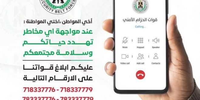 أعادت قوات الحزام الأمني، اليوم، نشر أرقام الخطوط الساخنة المخصصة لتلقي البلاغات والشكاوى المتعلقة بحالات الابتزاز، والرشوة، والمخالفات القانونية، التي اعلنت عنها في وقت سابق، وذلك في إطار حملة شاملة تحت شعار: “معركة مفتوحة ضد الابتزاز والرشوة”.