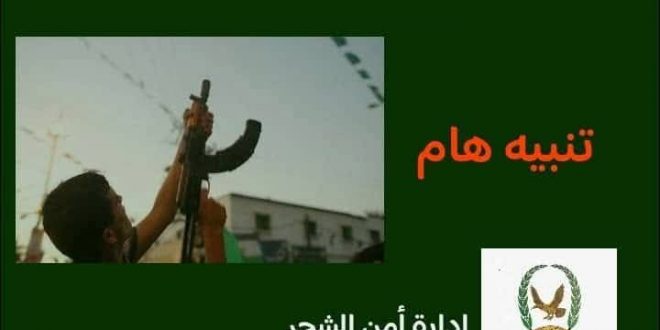 حذرت إدارة أمن مديرية الشحر الاخوة المواطنين من إطلاق النار في الاعراس أوالمناسبات التي تقلق السكينة العامة.