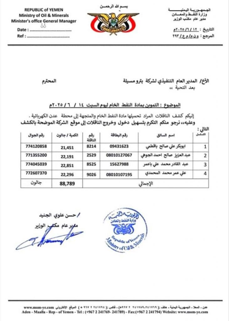 كشف مصدر في القطاع النفطي عن صدور توجيهات من وزير النفط والمعادن الدكتور سعيد الشماسي، تقضي بزيادة إمدادات العاصمة عدن من النفط الخام إلى 12 مقطورة يوميًا، بدءًا من يوم غد، وذلك لدعم وتحسين أداء منظومة الكهرباء في المدينة.