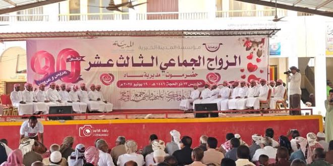 شهدت مديرية ساه، صباح اليوم الخميس، مهرجان الزواج الجماعي الثالث عشر، بمشاركة 90 عريساً وعروسة، وبرعاية كريمة من مؤسسة المدينة الخيرية وذلك في ساحة ثانوية الفقيد عوض باوزير، وسط حضور رسمي وشعبي كبير.