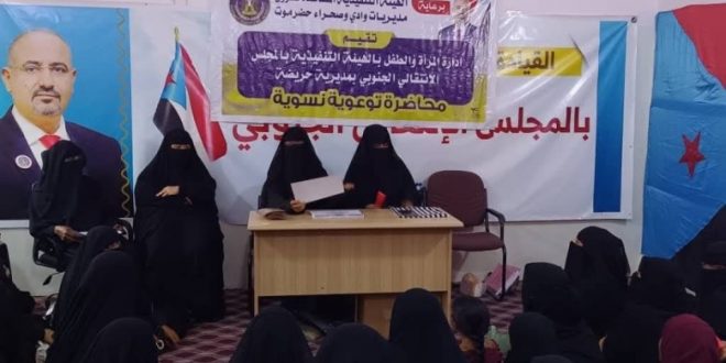 نظم قسم المرأة والطفل بالهيئة التنفيذية للقيادة المحلية للمجلس الانتقالي الجنوبي في مديرية حريضة بمحافظة حضرموت، السبت، محاضرة توعوية للنساء، بعنوان “اكتساب مهنة باليد.. خطوة نحو الاعتماد على الذات وتحسين سبل العيش”.