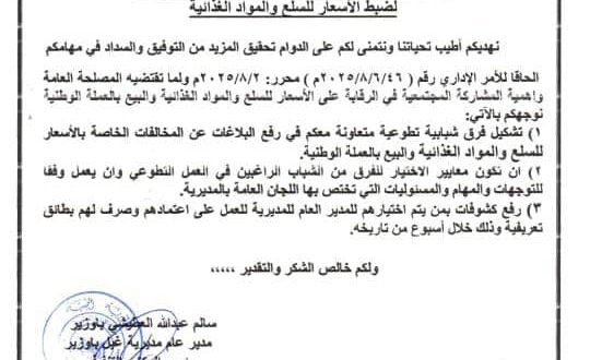 أصدر مدير عام مديرية غيل باوزير، رئيس المكتب التنفيذي، الأستاذ سالم عبدالله العطيشي باوزير، توجيهاً إلى رؤساء الأحياء السكنية يقضي بتشكيل فرق تطوعية شبابية مجتمعية، للمساهمة في تعزيز الرقابة على أسعار السلع والمواد الغذائية وضبط المخالفات، وذلك استناداً إلى الأمر الإداري رقم(2025/8/6/46م).