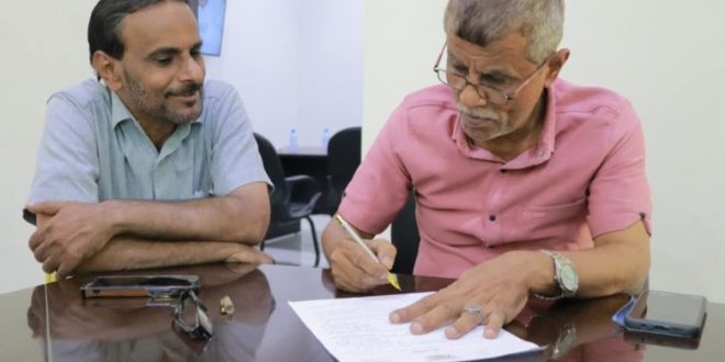 حضر التوقيع المهندس زين العيدروس مدير مؤسسة المياه بالشحر و المحامي فائق بن ضبيع مدير الدائرة القانونية بالادارة المحلية.