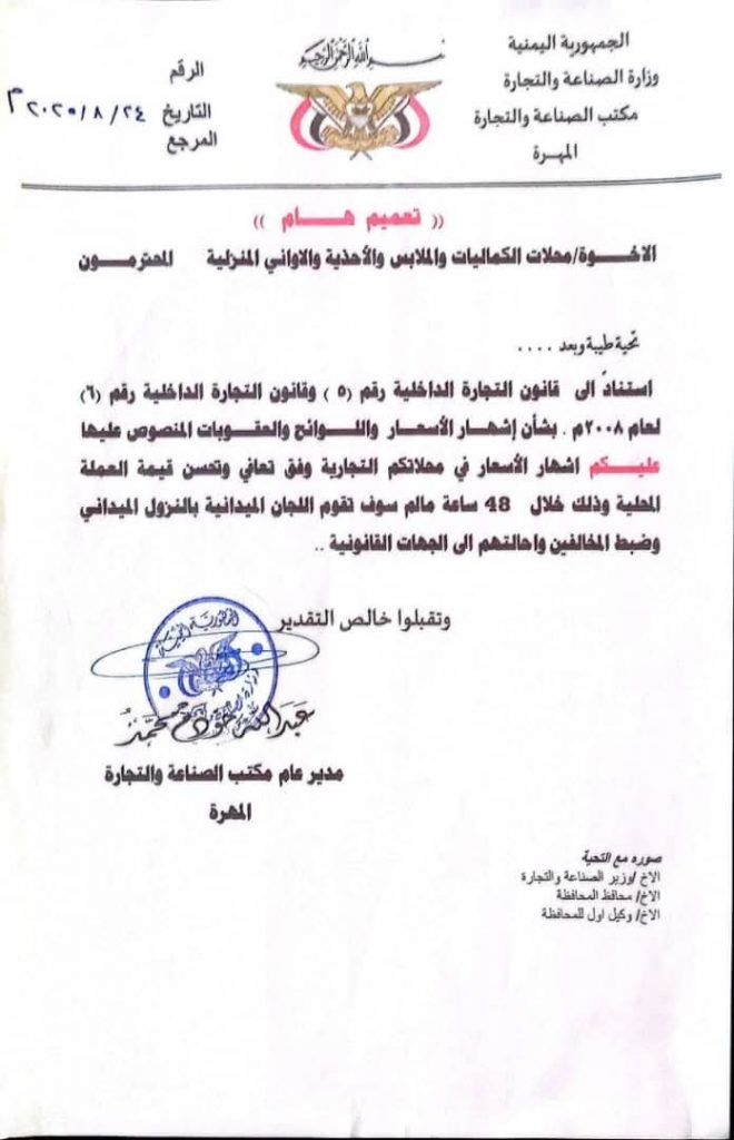 أصدر مكتب وزارة الصناعة والتجارة بمحافظة المهرة، اليوم الاثنين، حزمة من التعميمات الموجهة إلى مختلف الأنشطة التجارية بالمحافظة، استناداً إلى القوانين النافذة، وبهدف حماية المستهلك واستقرار الأسعار، تزامناً مع التحسن الملحوظ في قيمة العملة الوطنية وتعزيز دورها في السوق المحلية.