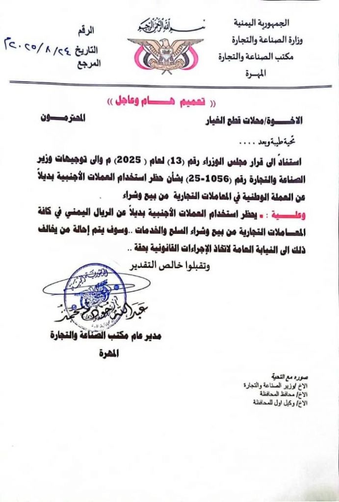 كما قضت التعميمات بإلزام محال بيع قطع الغيار بالتعامل الحصري بالريال اليمني، وحظر استخدام العملات الأجنبية كوسيلة للدفع، إلى جانب تسعير وإشهار جميع المنتجات بالعملة الوطنية، مع التأكيد على اتخاذ الإجراءات القانونية ضد أي مخالف لهذه التعليمات.