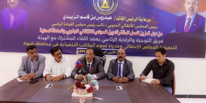 وكان رئيس تنفيذية انتقالي شبوة، قد تحدث بكلمة في مستهل اللقاء رحب من خلالها بالحاضرين، مؤكداً على أهمية هذا اللقاء للاطلاع عن قرب على سير العمل والإنجازات، مشيراً الى أهمية العمل المشترك في تجاوز التحديات، وبما يسهم في الارتقاء بدور المجلس وخدمة أبناء المحافظة.