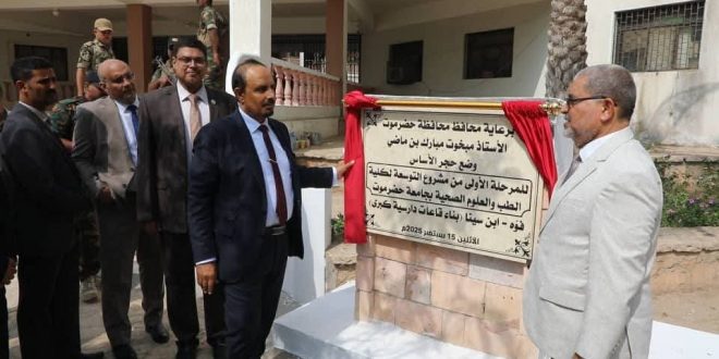 وضع محافظ حضرموت الاستاذ مبخوت مبارك بن ماضي اليوم، حجر الاساس للمرحلة الأولى لمشروع التوسعة لكلية الطب والعلوم الصحية بجامعة حضرموت، بحضور رئيس الجامعة البروفسور محمد سعيد خنبش وعميد الكلية البروفسور صالح عوض بحول.