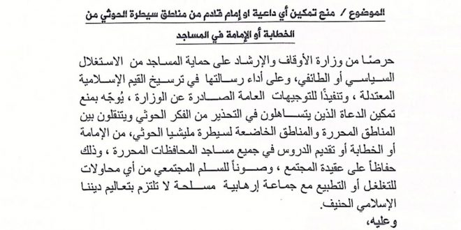 وأكدت الوزارة أن القرار يهدف إلى حماية المنابر الدينية من محاولات الاستغلال السياسي والطائفي، والحفاظ على الوسطية الإسلامية ومنع بث الأفكار الدخيلة التي يسعى الحوثيون لتمريرها عبر الخطباء.