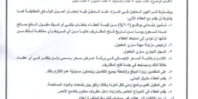 ويشترط للراغبين الدخول في المزاد عند الدخول فيه إحضار أصول الوثائق للمطابقة كما يشترط أن يقدم مع العطاء الآتي: