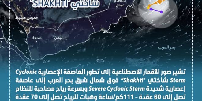 أفاد مركز التنبؤات الجوية والإنذار المبكر التابع للهيئة العامة للطيران المدني والأرصاد، بتطور العاصفة الإعصارية Cyclonic Storm “شاختي “Shakhti” فوق شمال شرق بحر العرب، إلى عاصفة إعصارية شديدة Severe Cyclonic Storm، وبسرعة رياح مصاحبة للنظام تصل إلى 60 عقدة ~ 111كم/ساعة، وهبات للرياح تصل إلى 70 عقدة ~ 130كم/ساعة، بحسب صور الأقمار الاصطناعية.