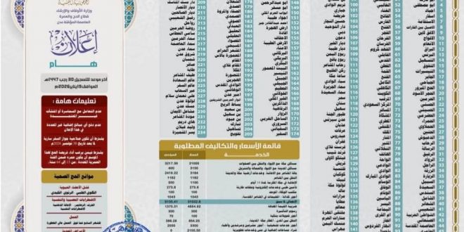 أعلنت قطاع الحج والعمرة بوزارة الأوقاف والإرشاد، عن قائمة المنشآت المعتمدة رسمياً لتفويج الحجاج اليمنيين لموسم حج 1447هـ، بعد استكمال عمليات التقييم والمراجعة، ومطابقة الشروط الفنية والإدارية المحددة.