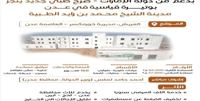 وعند دخوله الخدمة، سيضيف المستشفى 150 سريراً للطاقة الاستيعابية في عدن، مع حزمة خدمات تشمل الطوارئ، والأشعة، والمختبرات، والعمليات، والعيادات الخارجية، فضلاً عن مرافق مساندة تضمن استمرارية العمل على مدار الساعة.