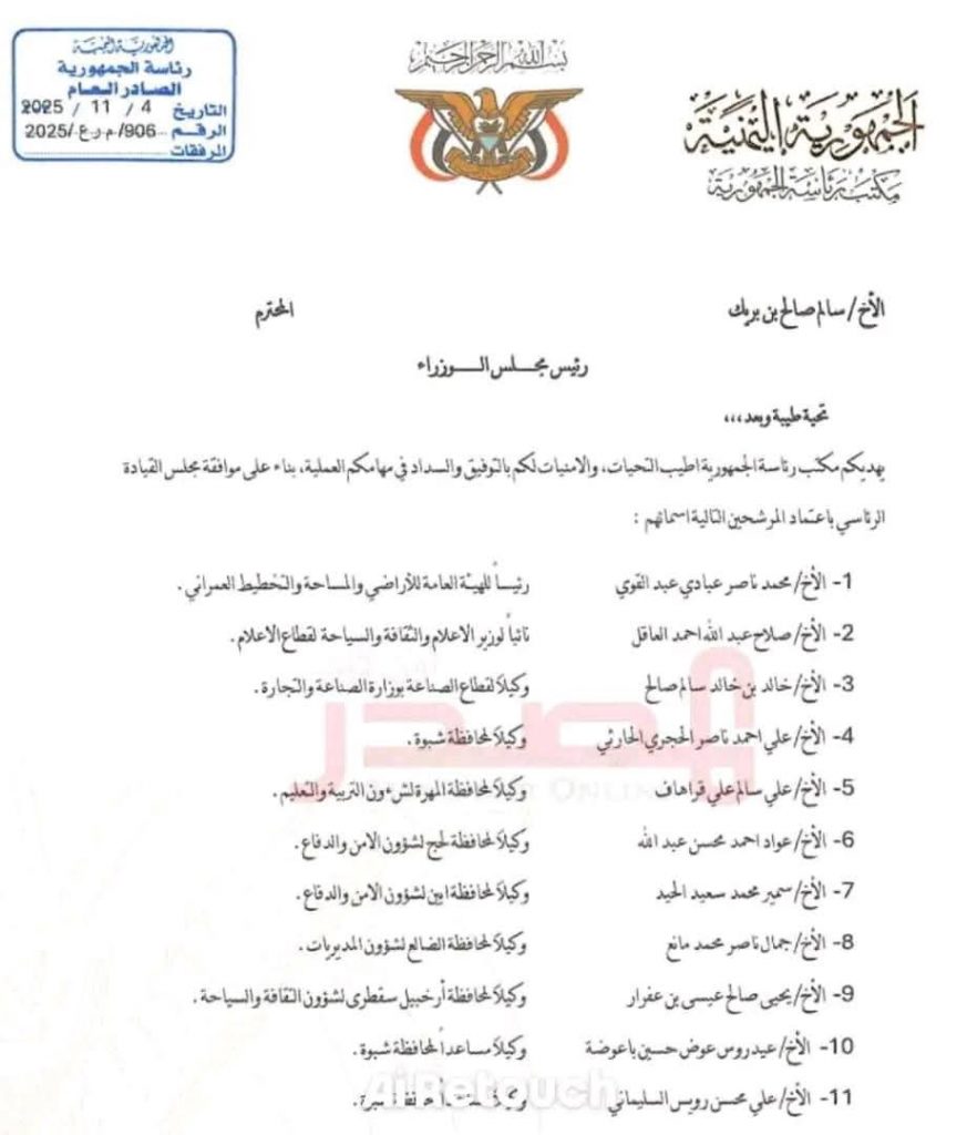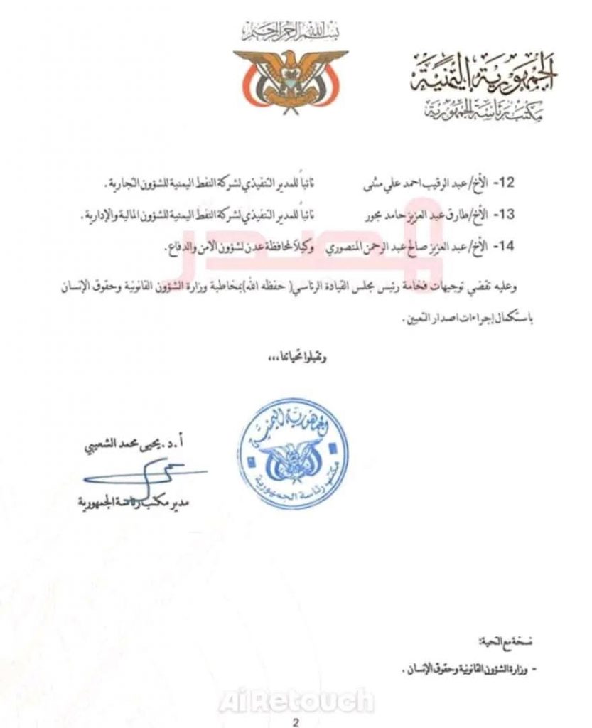 صادق مكتب رئاسة مجلس القيادة الرئاسي على قرارات رئيس المجلس الانتقالي الجنوبي القائد عيدروس قاسم الزُبيدي، بشأن التعيينات الأخيرة.