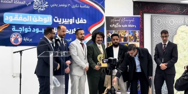 وبدأت الاحتفالية التي نظّمها مجلس يافع العام في المملكة المتحدة، بعرض الأوبيريت الوطني “الوطن المفقود”، الذي قدّمته فرقة كبيرة من الفنانين الجنوبيين بقيادة الفنان الكبير عبود خواجة، إلى جانب عروض موسيقية وغنائية ورقصات شعبية تراثية عبّرت عن قضايا الوطن وذكرياته ومؤكدة على أهمية هذه المناسبة في تعزيز قيم الانتماء والوفاء للوطن، بالإضافة إلى تكريم الفنان الكبير عبود خواجة، تقديرًا لدوره الكبير في إثراء الأغنية الجنوبية والعربية، والحفاظ على التراث الموسيقي الجنوبي الأصيل.