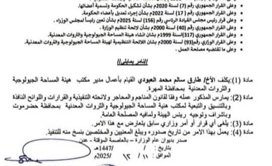 يأتي هذا التكليف في إطار جهود وزارة النفط والمعادن لتعزيز العمل الفني والمؤسسي ورفع كفاءة الأداء في القطاعات الجيولوجية والمعدنية في محافظة المهرة.