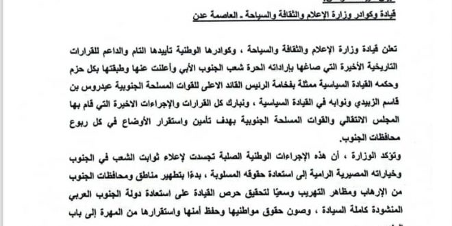 وشددت الوزارة على التزامها الثابت بالمشروع الوطني للجنوب وتطلعه في التحرير والاستقلال حتى تحقيق إعلان دولة الجنوب المنشودة كاملة السيادة ، مؤكدة الالتزام بتوجيهات القيادة السياسية في خدمة الوطن عبر أداء رسالتها الإعلامية والثقافية والسياحية.