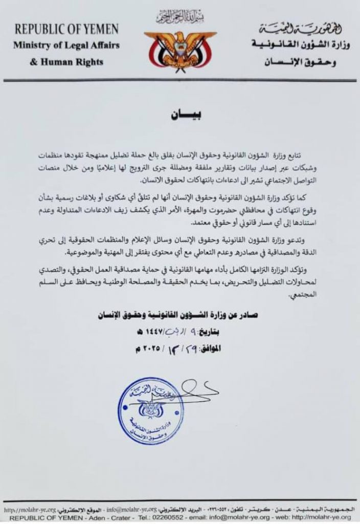 كما تؤكد وزارة الشؤون القانونية وحقوق الإنسان أنها لم تتلقَّ أي شكاوى أو بلاغات رسمية بشأن وقائع انتهاكات لحقوق الإنسان، وأن ما يتم تداوله من ادعاءات لا يستند إلى أي مسار قانوني أو حقوقي معتمد.
