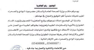 حضرموت(حضارم اليوم) خاص أصدر مكتب وزارة الصحة العامة والسكان بوادي وصحراء حضرموت، اليوم، تعميمًا عاجلًا قضى برفع مستوى الجاهزية القصوى في المستشفيات والمرافق الصحية الحكومية والأهلية، وذلك في إطار الإجراءات الاستباقية لتعزيز قدرات القطاع الصحي والاستعداد لأي طارئ. وجاء في التعميم، الصادر عن المدير العام للمكتب الدكتور هاني خالد العمودي، …